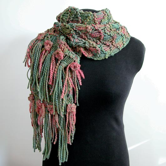 You will find in my shop one-of-a-kind and limited edition accessories. You could discover the perfect little purse for that special event, a lovely wrap to wear to the ballroom or to the beach, a dramatic scarf out of handspun yarn, a daintier scarf out of clusters of ultra-thin threads, a spunky hat, or some classic and warm winter accessories.
